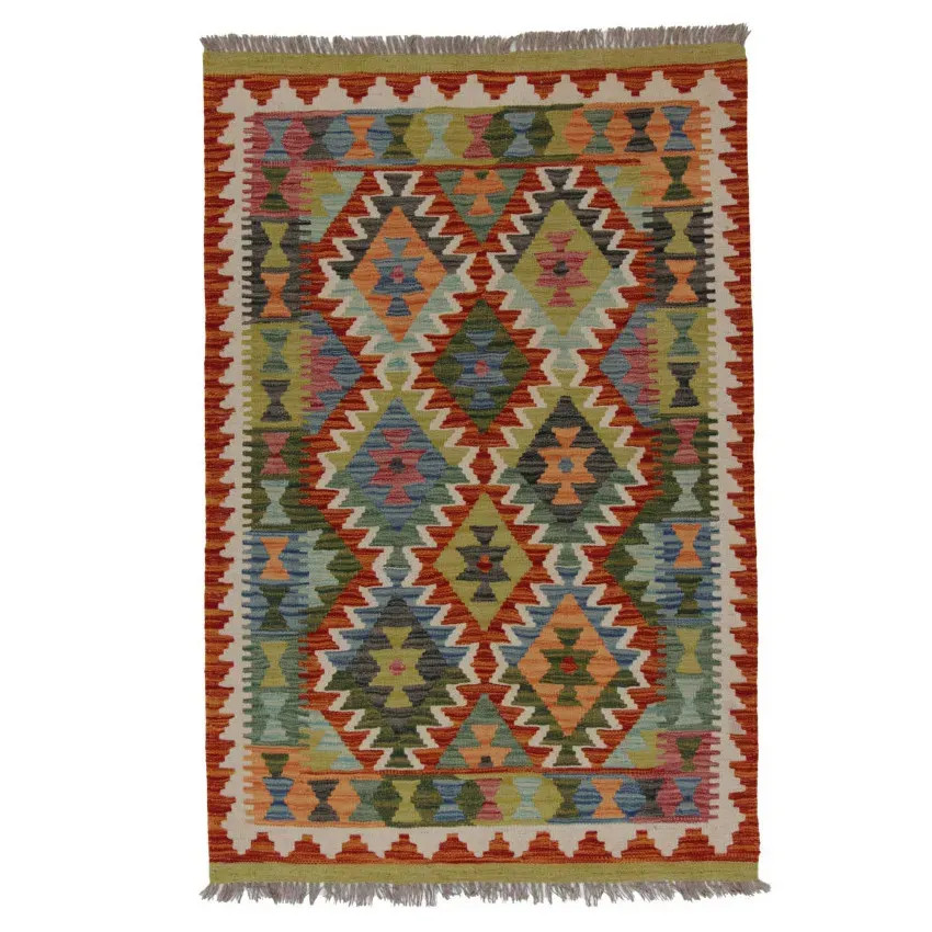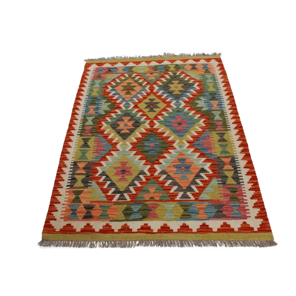 Chobi Kelim rugs are very popular all over the world. In Afghanistan, they are hand woven by nomads and villagers. This type of Afghan Kelim rug is denser and more compact than other Kelim rugs. They are woven using a special technique which makes them thinner and therefore relatively quicker to weave than traditional oriental rugs.. After making, they are washed four times and then sun-dried. Afghan Kelim rugs have a traditional warm antique design, but are often available in a more modern version. They are very popular, mainly because they blend perfectly with most room colours, and fall into the category of reasonably priced rugs. They can be used as a decorative feature in the home, as a wall rug or as a traditional floor covering. Kelim, is the perfect rug for the living room or even for hallways or corridors as a runner rug.