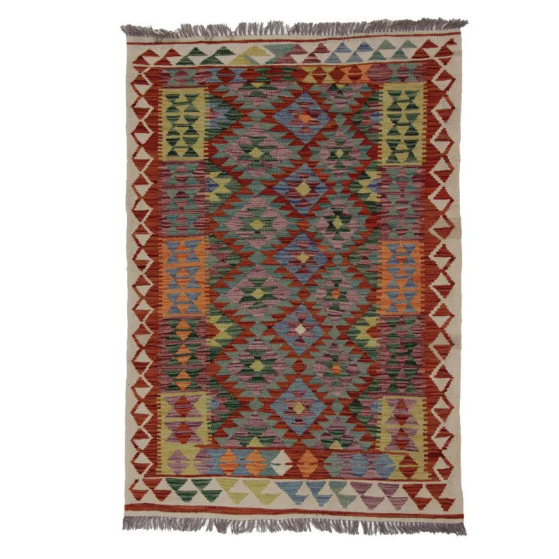 Chobi Kelim rugs are very popular all over the world. In Afghanistan, they are hand woven by nomads and villagers. This type of Afghan Kelim rug is denser and more compact than other Kelim rugs. They are woven using a special technique which makes them thinner and therefore relatively quicker to weave than traditional oriental rugs.. After making, they are washed four times and then sun-dried. Afghan Kelim rugs have a traditional warm antique design, but are often available in a more modern version. They are very popular, mainly because they blend perfectly with most room colours, and fall into the category of reasonably priced rugs. They can be used as a decorative feature in the home, as a wall rug or as a traditional floor covering. Kelim, is the perfect rug for the living room or even for hallways or corridors as a runner rug.