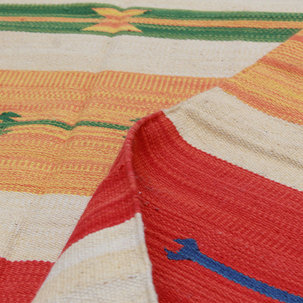 The Indian kilim rug is a special decorative item that comes to us directly from India. The modern kilim rug is extremely lightweight, making it an excellent choice as a wall rug as it weighs less than 1kg per square metre. It is made using special manufacturing methods, which means that Indian kilim rugs are thinner and available faster than their conventional counterparts. In India, large-scale manufactories work on the mass production of these Kilim rugs, combining hand and machine weaving. The design of Indian Kilim carpets is modern and includes a variety of bright colours. Due to their widespread popularity, they can be found in many homes, be it walls or floors. They are also an excellent choice for hallways in runner rug sizes. Whether in the living room or hallway, they create a special atmosphere in any room. Indian cotton kilims are stunningly colourful and the intensity of this colour does not fade with washing. Their affordable price makes them a pleasure to use in many homes. The rug can also be placed over underfloor heating as it has heat transfer properties.