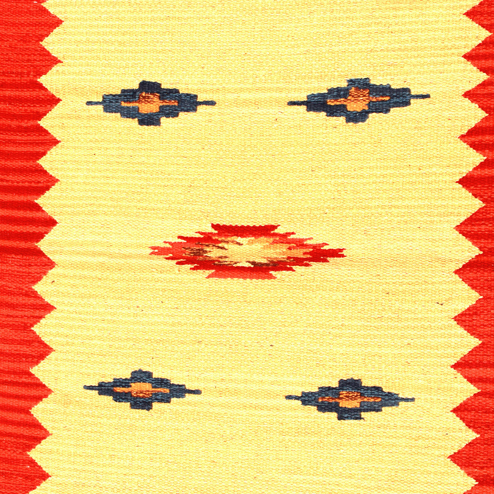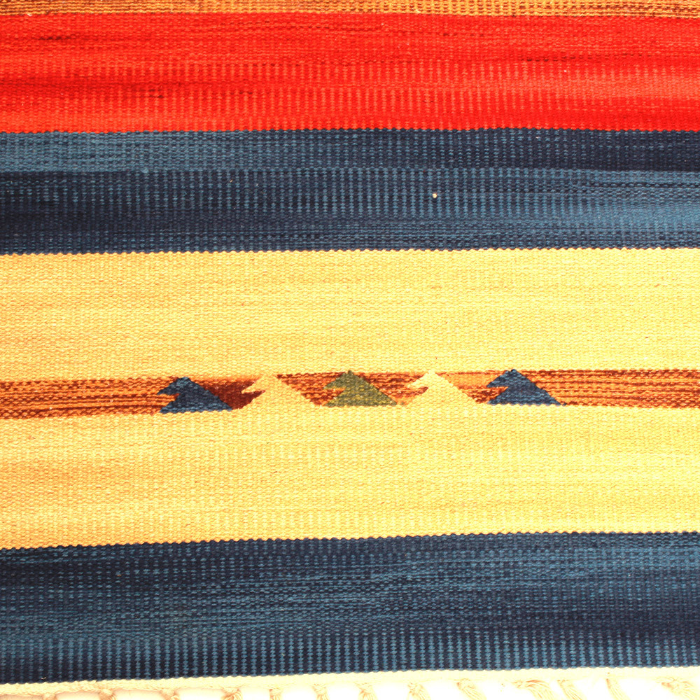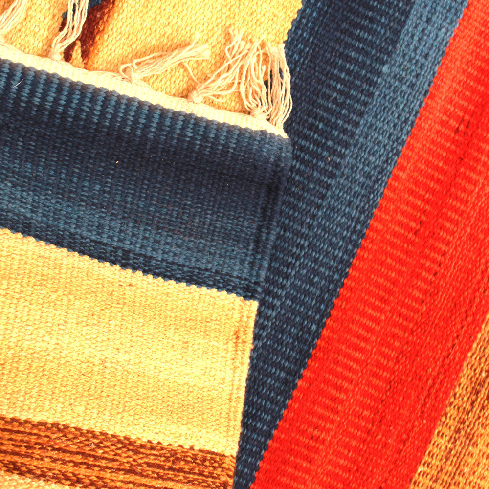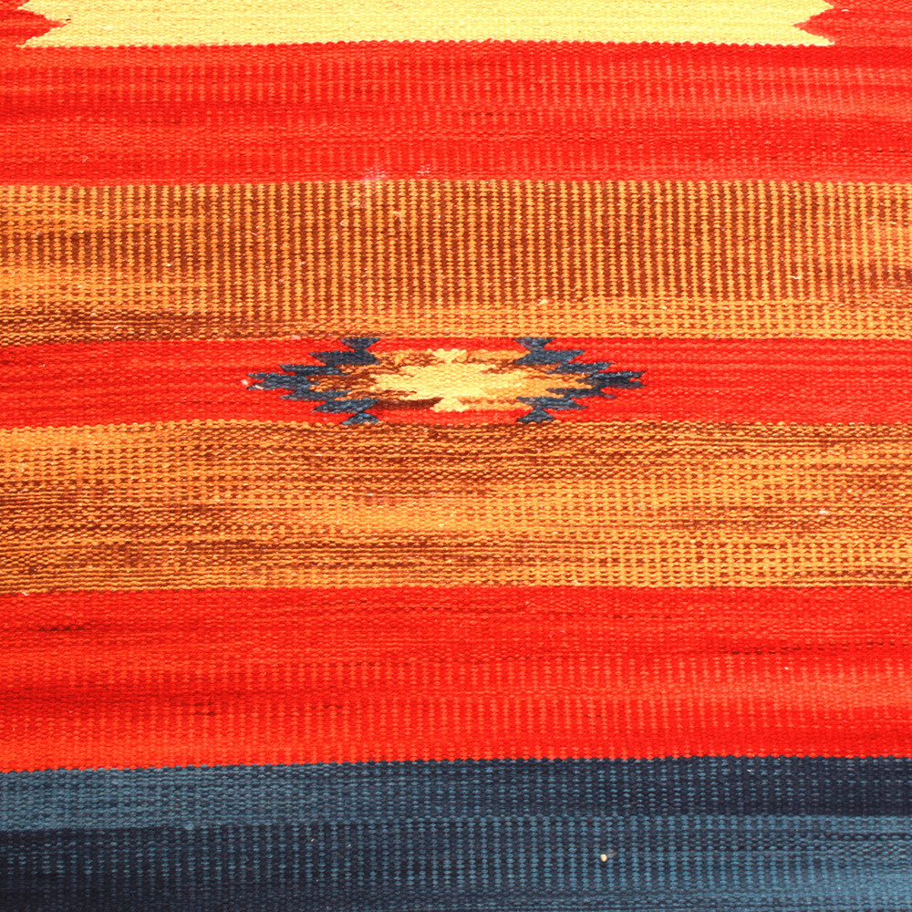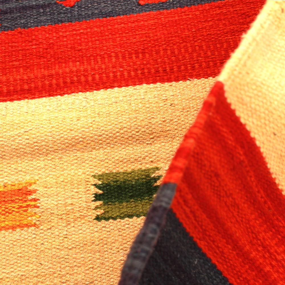 The Indian kilim rug is a special decorative item that comes to us directly from India. The modern kilim rug is extremely lightweight, making it an excellent choice as a wall rug as it weighs less than 1kg per square metre. It is made using special manufacturing methods, which means that Indian kilim rugs are thinner and available faster than their conventional counterparts. In India, large-scale manufactories work on the mass production of these Kilim rugs, combining hand and machine weaving. The design of Indian Kilim carpets is modern and includes a variety of bright colours. Due to their widespread popularity, they can be found in many homes, be it walls or floors. They are also an excellent choice for hallways in runner rug sizes. Whether in the living room or hallway, they create a special atmosphere in any room. Indian cotton kilims are stunningly colourful and the intensity of this colour does not fade with washing. Their affordable price makes them a pleasure to use in many homes. The rug can also be placed over underfloor heating as it has heat transfer properties.