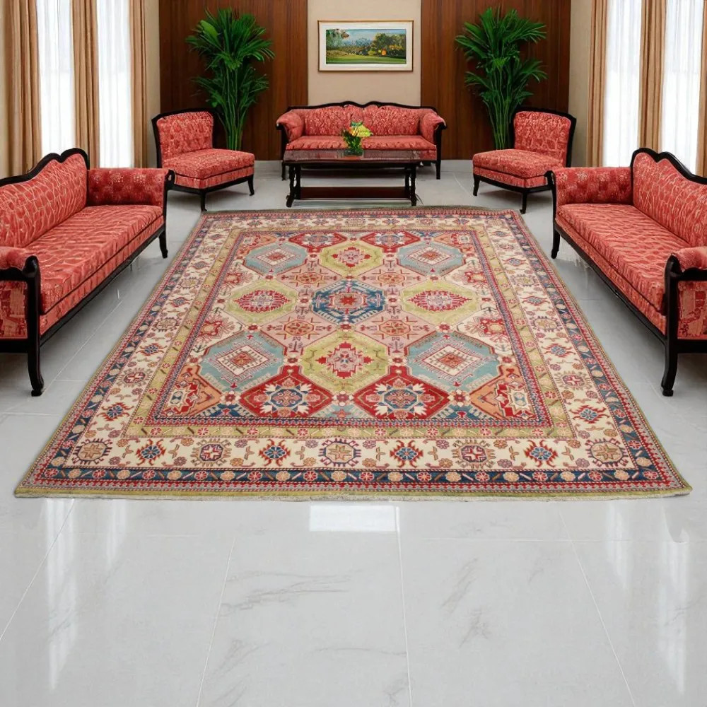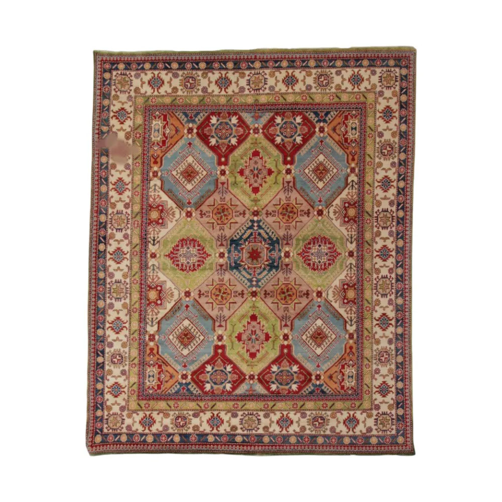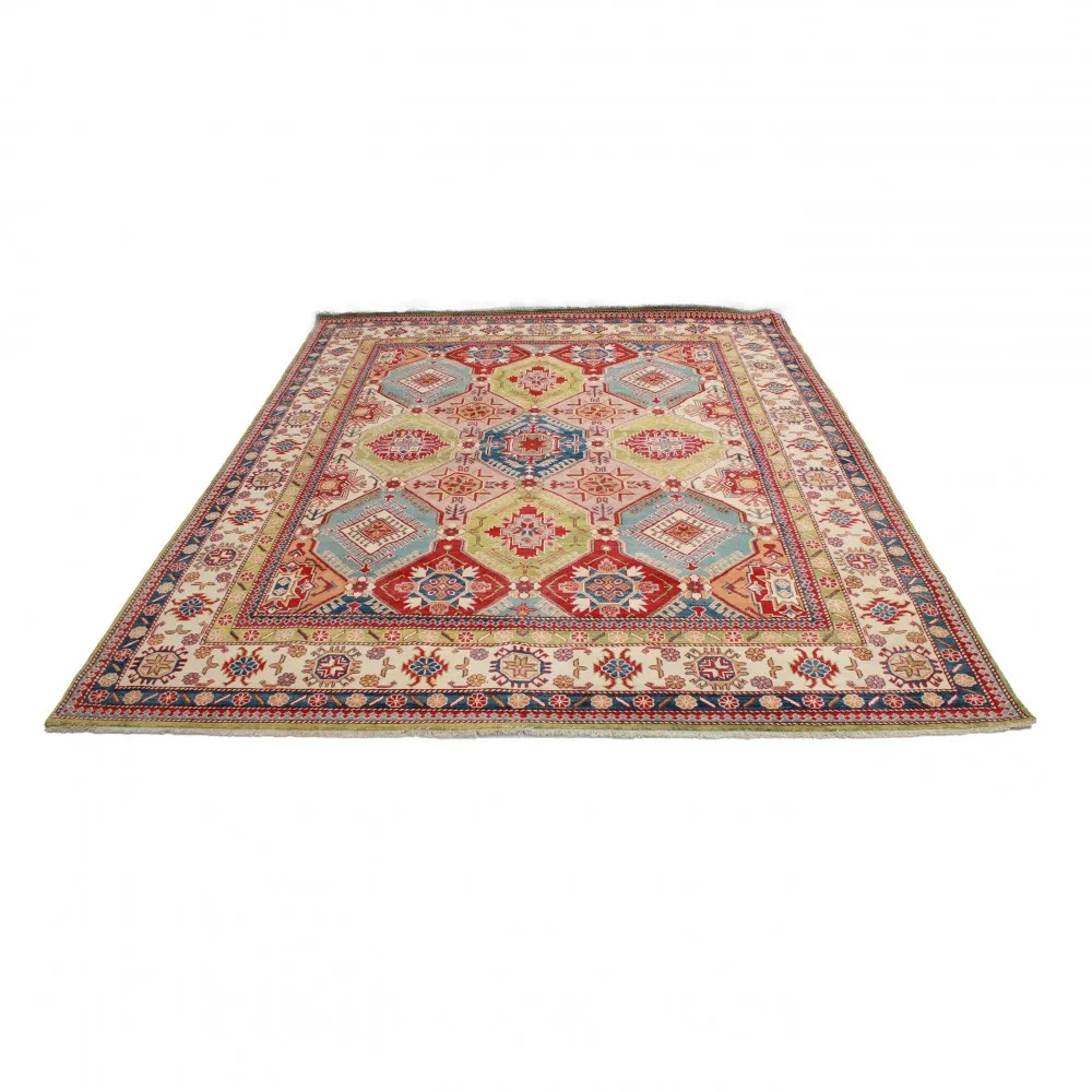 Kazak carpet has become popular mainly because of its warm yet light colours. It is most often recommended by interior designers for classically decorated homes. Its designs are inspired by Russian geometric patterns. It's just called Kazak carpet, but it's an Afghan carpet. The used wool is coloured with natural vegetable dyes. The Kazak Oriental carpet is characterised by a strong colour scheme. Its advantage is that, thanks to its bright colours, it does not darken the atmosphere of your room. As a living room carpet, it matches perfectly with the colours of sofas or coffee tables. As a bedroom carpet, it is also used on the two sides of the bed. In this case, it is sufficient if the colours of the carpets are matching. Every step of the carpet making process is 100% handmade. It can be laid in the busiest living rooms thanks to its durability. The Kazak oriental carpet knotting technique is called Gheordes, which means double knotting. Once the carpet is finished, it is washed four times and then left to dry in the sun. It does not contain any allergenic substances.