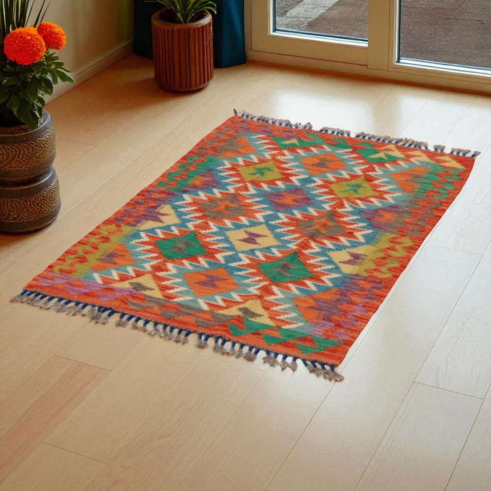 Afghan hand woven rugs, a masterpiece of Afghan craftsmanship, are highly appreciated and popular all over the world. These special hand woven rugs are typically denser and more compact than other types of Kelim due to a special weaving technique. This technique allows Afghan hand woven rugs to have a thinner texture and to be finished more quickly than knotted rugs. Chobi Kelim rug designs combine antique and modern elements, so that everyone can find a piece to suit their style. These hand woven rugs are particularly popular with interior designers as they blend harmoniously with the colours of most homes and are widely affordable due to their accessible price category. Chobi Kilim rugs can be used in a variety of ways to decorate a home, whether as a wall hanging rug or as a hallway rug. These ethnic rugs have a significant artistic and cultural value. Afghan hand woven rugs are not only aesthetically pleasing, but are also of great historical and cultural significance. Hand woven rugs preserve the rich tradition and heritage of Afghan craftsmanship, each one unique and unparalleled. The wool rugs, with their natural use of materials, help to create a homely and welcoming atmosphere.