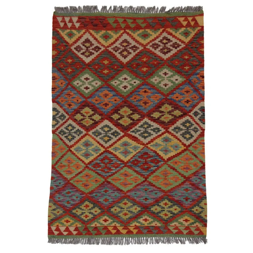Chobi Kelim rugs are very popular all over the world. In Afghanistan, they are hand woven by nomads and villagers. This type of Afghan Kelim rug is denser and more compact than other Kelim rugs. They are woven using a special technique which makes them thinner and therefore relatively quicker to weave than traditional oriental rugs.. After making, they are washed four times and then sun-dried. Afghan Kelim rugs have a traditional warm antique design, but are often available in a more modern version. They are very popular, mainly because they blend perfectly with most room colours, and fall into the category of reasonably priced rugs. They can be used as a decorative feature in the home, as a wall rug or as a traditional floor covering. Kelim, is the perfect rug for the living room or even for hallways or corridors as a runner rug.