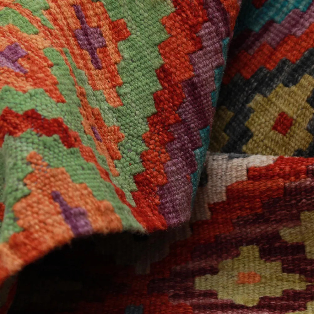 The Chobi Kilim is renowned for its vibrant colors and intricate patterns, making it a striking addition to any room. Its lightweight nature allows it to be used not only as a floor covering but also as a wall hanging. The rug is washed four times during production to ensure lasting color, and its 4-5 mm thickness provides a comfortable texture underfoot. With its roots in nomadic culture, this Kilim rug not only serves as a decorative piece but also as a symbol of Afghan heritage.