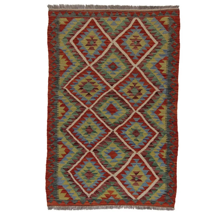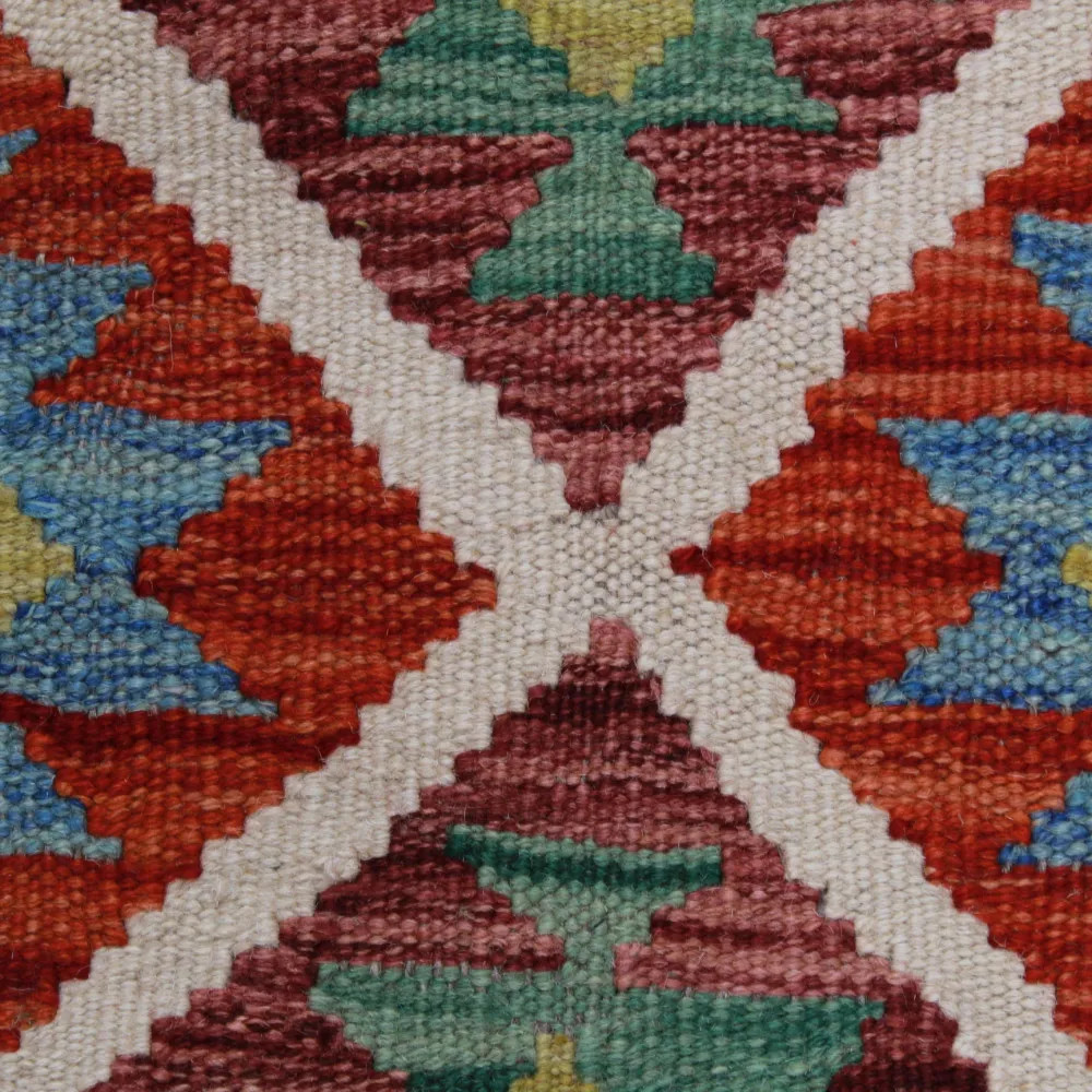 Chobi Kelim rugs are very popular all over the world. In Afghanistan, they are hand woven by nomads and villagers. This type of Afghan Kelim rug is denser and more compact than other Kelim rugs. They are woven using a special technique which makes them thinner and therefore relatively quicker to weave than traditional oriental rugs.. After making, they are washed four times and then sun-dried. Afghan Kelim rugs have a traditional warm antique design, but are often available in a more modern version. They are very popular, mainly because they blend perfectly with most room colours, and fall into the category of reasonably priced rugs. They can be used as a decorative feature in the home, as a wall rug or as a traditional floor covering. Kelim, is the perfect rug for the living room or even for hallways or corridors as a runner rug.