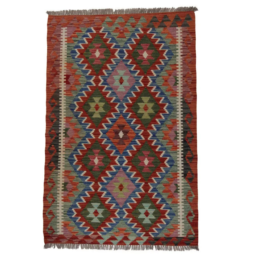 Chobi Kelim rugs are very popular all over the world. In Afghanistan, they are hand woven by nomads and villagers. This type of Afghan Kelim rug is denser and more compact than other Kelim rugs. They are woven using a special technique which makes them thinner and therefore relatively quicker to weave than traditional oriental rugs.. After making, they are washed four times and then sun-dried. Afghan Kelim rugs have a traditional warm antique design, but are often available in a more modern version. They are very popular, mainly because they blend perfectly with most room colours, and fall into the category of reasonably priced rugs. They can be used as a decorative feature in the home, as a wall rug or as a traditional floor covering. Kelim, is the perfect rug for the living room or even for hallways or corridors as a runner rug.