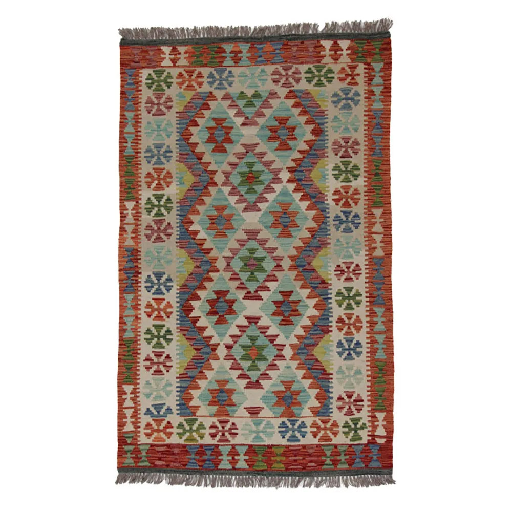 Discover the exquisite charm of the Chobi Kilim rug, a masterpiece that brings elegance to any space. This handwoven nomad Kelim rug in the size of 157x98 is designed to captivate with its intricate patterns and vibrant colors, making it a perfect addition to your home decor.