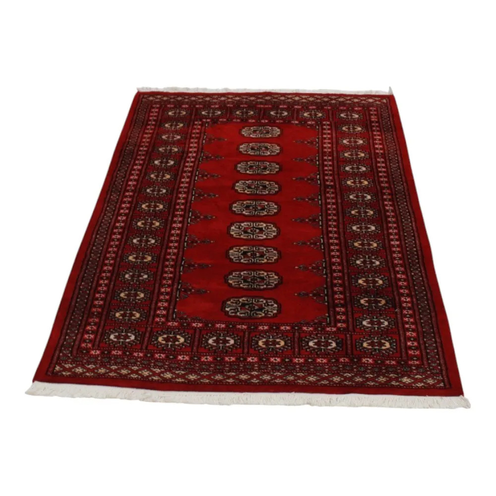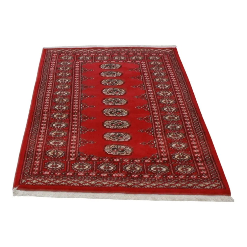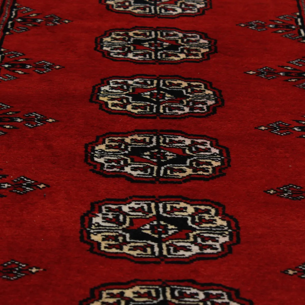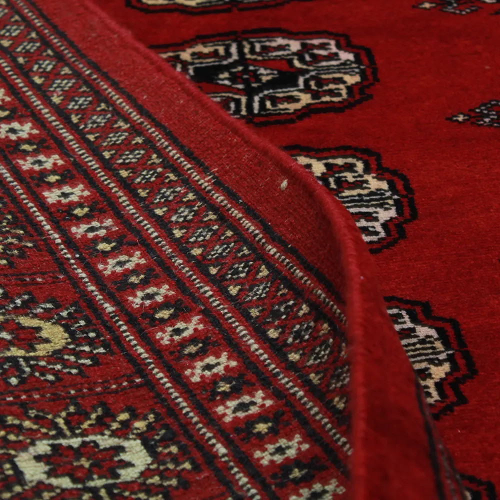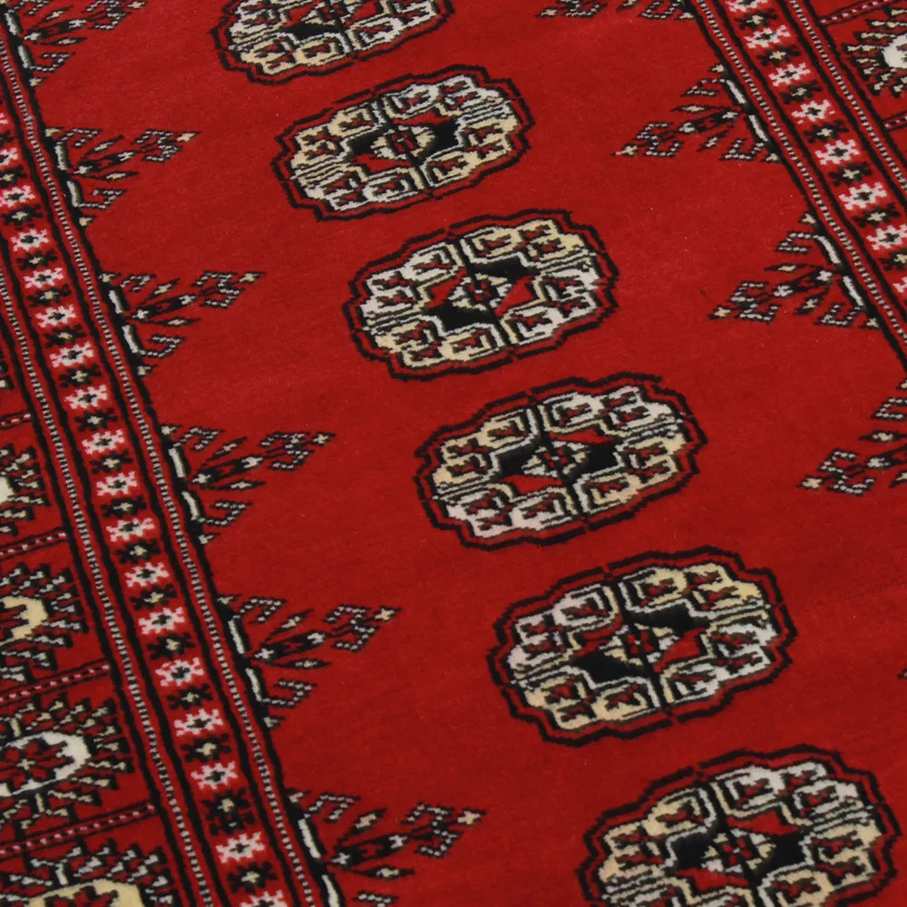 Pakistani carpet is made in the provinces of Punjab and Sindh. Reflecting a centuries-old tradition, this oriental carpet is a tribute to the craftsmanship and artistry of artisans. Pakistani carpets are renowned worldwide for their quality and carry the rich cultural heritage of Pakistan. The design and manufacturing techniques of this oriental carpet originate from the Turkmen people, who traded them in the old carpet market of the famous city of Bukhara. One of the most famous designs (Bukhara) takes its name from here and has been a defining feature of these beautiful oriental carpets ever since. Pakistani carpets are made from New Zealand Merino wool, which provides outstanding quality and durability. Thanks to their dense knotting, they are long-lasting and resistant to wear and tear from everyday use. This elegant rug is now considered one of the finest wool rugs in Pakistan. After being made and sheared, the carpet is washed four times and then carefully dried to retain its vibrant colours and colour fastness. With their geometric patterns and elegant colours, they add a unique ambience to your home, whether it's a living room carpet to enhance the elegance of the room or a bedroom carpet that adds comfort and softness to your steps. Also, an ideal choice for hallways is the Pakistani runner carpet. If you are looking for a unique oriental carpet that is made of quality material and shows artistic craftsmanship, Pakistani wool carpets are the perfect choice. The harmonious combination of sophisticated patterns and vibrant colours will create a magical atmosphere in any part of the room. A Pakistani carpet is not only aesthetically pleasing but also extremely practical. Its densely knotted surface is durable and resistant, allowing it to remain in beautiful condition for many years. In addition, the natural properties of the wool material allow it to insulate the floor, giving it excellent thermal insulation properties. Pakistani carpets are available in a wide range of sizes and shapes, so everyone can find the best one for their home.