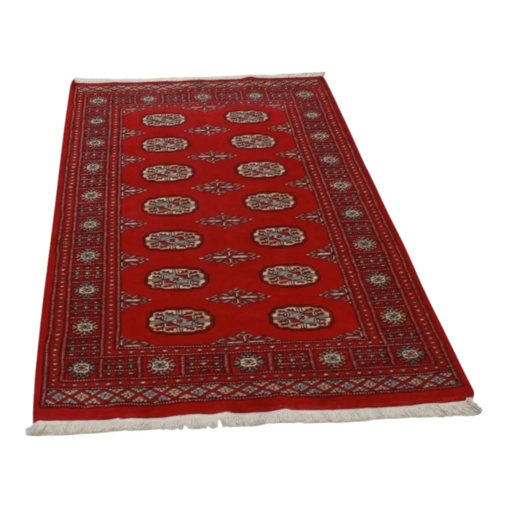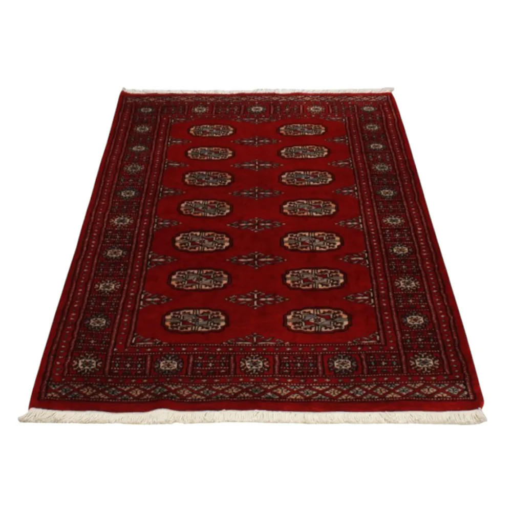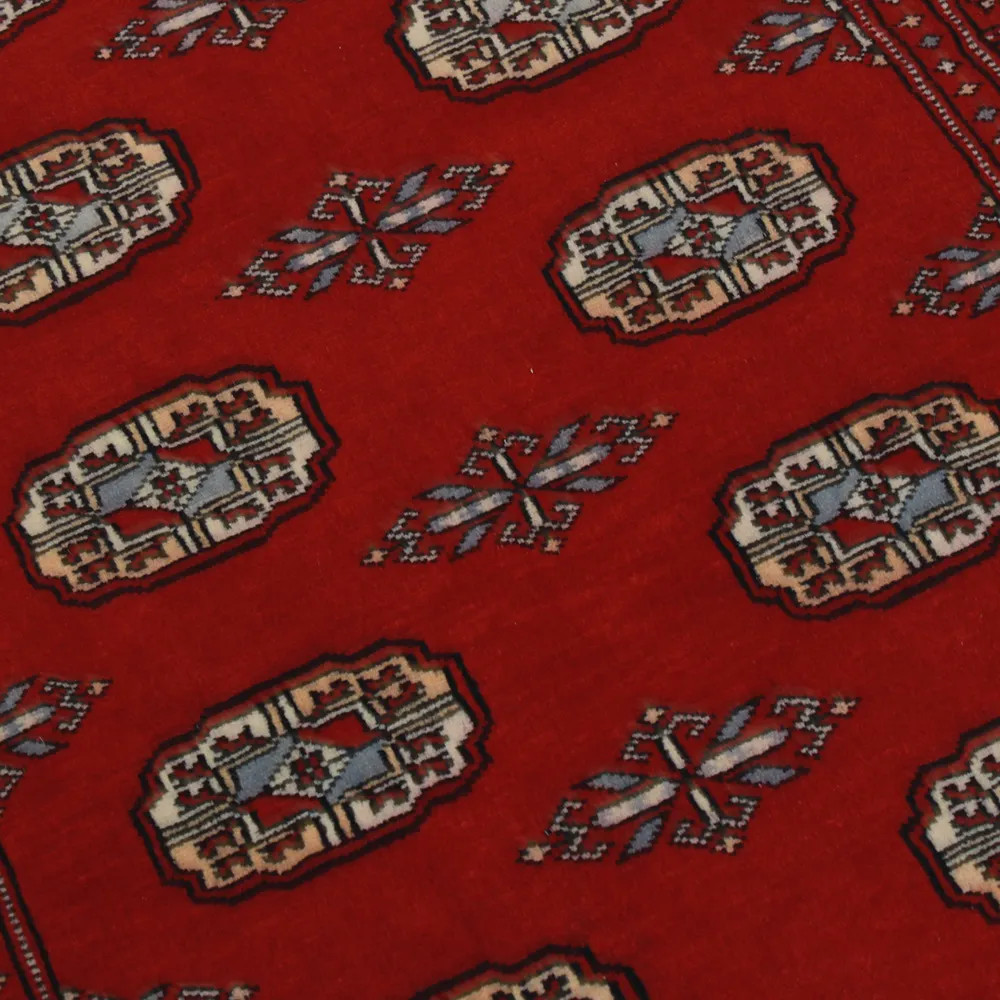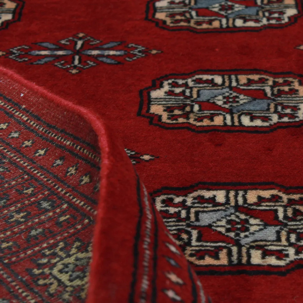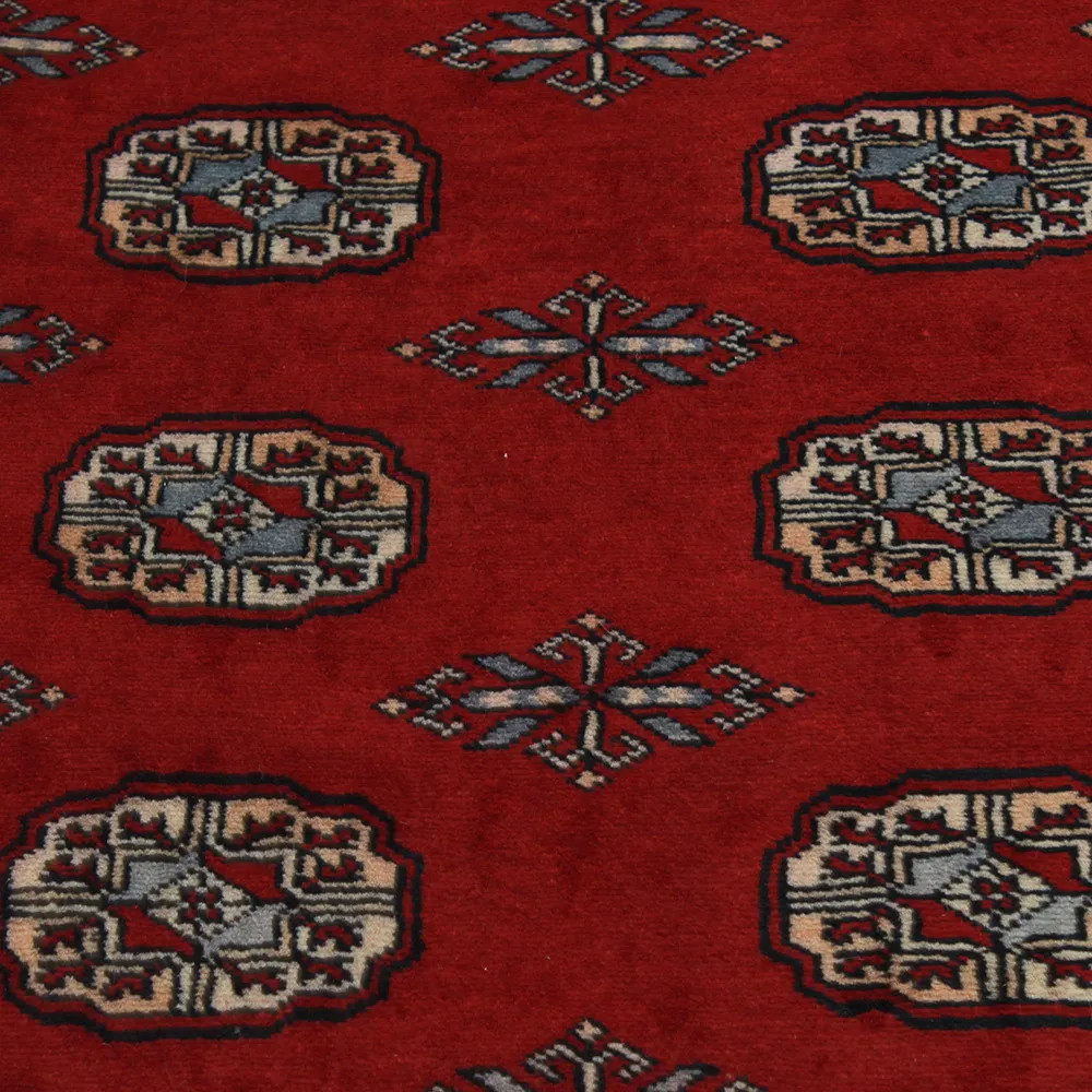 Pakistani carpet is made in the provinces of Punjab and Sindh. Reflecting a centuries-old tradition, this oriental carpet is a tribute to the craftsmanship and artistry of artisans. Pakistani carpets are renowned worldwide for their quality and carry the rich cultural heritage of Pakistan. The design and manufacturing techniques of this oriental carpet originate from the Turkmen people, who traded them in the old carpet market of the famous city of Bukhara. One of the most famous designs (Bukhara) takes its name from here and has been a defining feature of these beautiful oriental carpets ever since. Pakistani carpets are made from New Zealand Merino wool, which provides outstanding quality and durability. Thanks to their dense knotting, they are long-lasting and resistant to wear and tear from everyday use. This elegant rug is now considered one of the finest wool rugs in Pakistan. After being made and sheared, the carpet is washed four times and then carefully dried to retain its vibrant colours and colour fastness. With their geometric patterns and elegant colours, they add a unique ambience to your home, whether it's a living room carpet to enhance the elegance of the room or a bedroom carpet that adds comfort and softness to your steps. Also, an ideal choice for hallways is the Pakistani runner carpet. If you are looking for a unique oriental carpet that is made of quality material and shows artistic craftsmanship, Pakistani wool carpets are the perfect choice. The harmonious combination of sophisticated patterns and vibrant colours will create a magical atmosphere in any part of the room. A Pakistani carpet is not only aesthetically pleasing but also extremely practical. Its densely knotted surface is durable and resistant, allowing it to remain in beautiful condition for many years. In addition, the natural properties of the wool material allow it to insulate the floor, giving it excellent thermal insulation properties. Pakistani carpets are available in a wide range of sizes and shapes, so everyone can find the best one for their home.