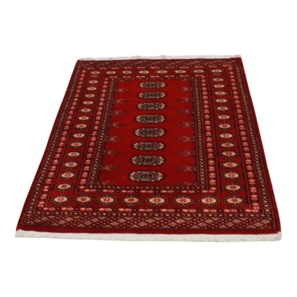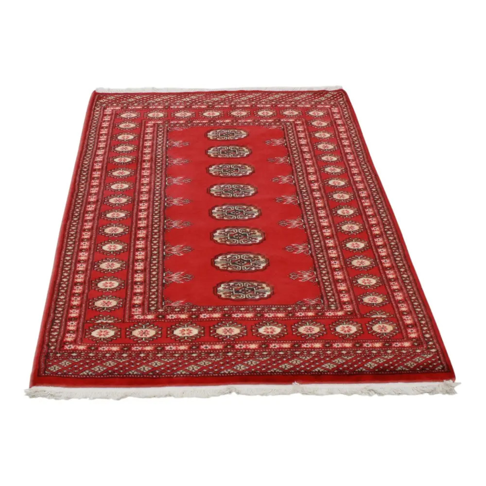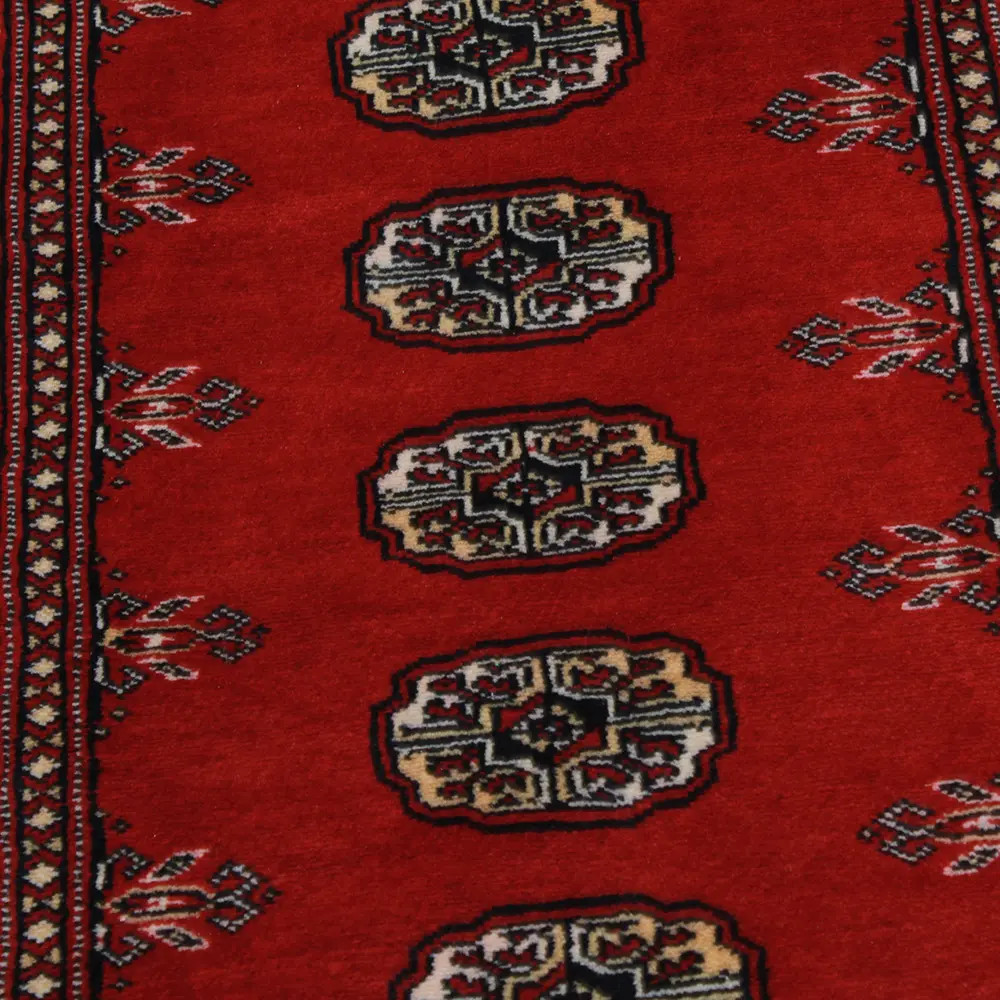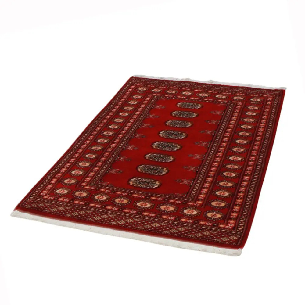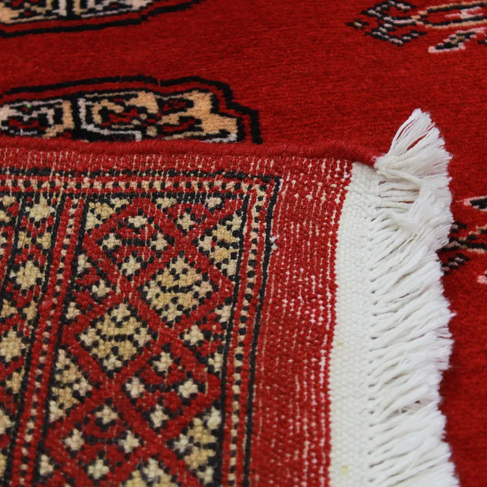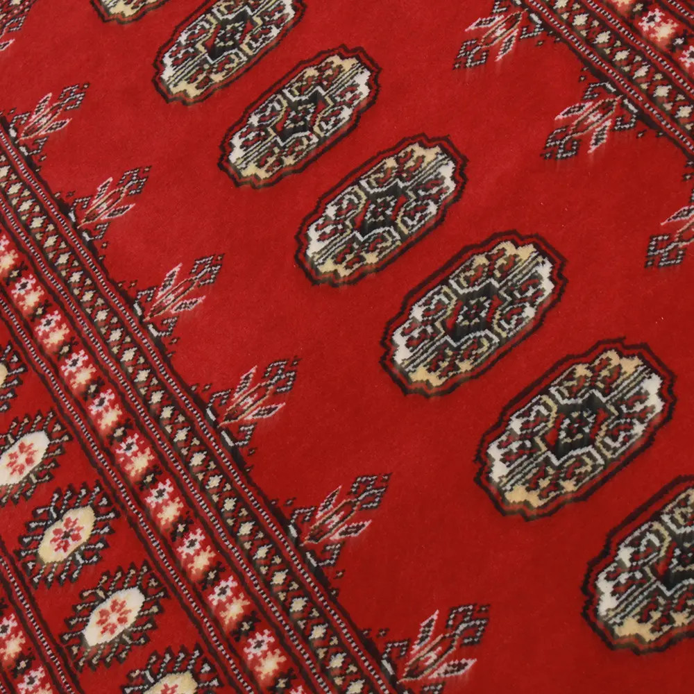 Pakistani carpet is made in the provinces of Punjab and Sindh. Reflecting a centuries-old tradition, this oriental carpet is a tribute to the craftsmanship and artistry of artisans. Pakistani carpets are renowned worldwide for their quality and carry the rich cultural heritage of Pakistan. The design and manufacturing techniques of this oriental carpet originate from the Turkmen people, who traded them in the old carpet market of the famous city of Bukhara. One of the most famous designs (Bukhara) takes its name from here and has been a defining feature of these beautiful oriental carpets ever since. Pakistani carpets are made from New Zealand Merino wool, which provides outstanding quality and durability. Thanks to their dense knotting, they are long-lasting and resistant to wear and tear from everyday use. This elegant rug is now considered one of the finest wool rugs in Pakistan. After being made and sheared, the carpet is washed four times and then carefully dried to retain its vibrant colours and colour fastness. With their geometric patterns and elegant colours, they add a unique ambience to your home, whether it's a living room carpet to enhance the elegance of the room or a bedroom carpet that adds comfort and softness to your steps. Also, an ideal choice for hallways is the Pakistani runner carpet. If you are looking for a unique oriental carpet that is made of quality material and shows artistic craftsmanship, Pakistani wool carpets are the perfect choice. The harmonious combination of sophisticated patterns and vibrant colours will create a magical atmosphere in any part of the room. A Pakistani carpet is not only aesthetically pleasing but also extremely practical. Its densely knotted surface is durable and resistant, allowing it to remain in beautiful condition for many years. In addition, the natural properties of the wool material allow it to insulate the floor, giving it excellent thermal insulation properties. Pakistani carpets are available in a wide range of sizes and shapes, so everyone can find the best one for their home.