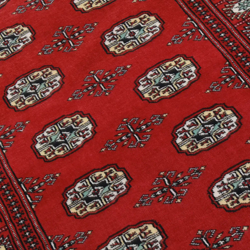 Pakistani carpet is made in the provinces of Punjab and Sindh. Reflecting a centuries-old tradition, this oriental carpet is a tribute to the craftsmanship and artistry of artisans. Pakistani carpets are renowned worldwide for their quality and carry the rich cultural heritage of Pakistan. The design and manufacturing techniques of this oriental carpet originate from the Turkmen people, who traded them in the old carpet market of the famous city of Bukhara. One of the most famous designs (Bukhara) takes its name from here and has been a defining feature of these beautiful oriental carpets ever since. Pakistani carpets are made from New Zealand Merino wool, which provides outstanding quality and durability. Thanks to their dense knotting, they are long-lasting and resistant to wear and tear from everyday use. This elegant rug is now considered one of the finest wool rugs in Pakistan. After being made and sheared, the carpet is washed four times and then carefully dried to retain its vibrant colours and colour fastness. With their geometric patterns and elegant colours, they add a unique ambience to your home, whether it's a living room carpet to enhance the elegance of the room or a bedroom carpet that adds comfort and softness to your steps. Also, an ideal choice for hallways is the Pakistani runner carpet. If you are looking for a unique oriental carpet that is made of quality material and shows artistic craftsmanship, Pakistani wool carpets are the perfect choice. The harmonious combination of sophisticated patterns and vibrant colours will create a magical atmosphere in any part of the room. A Pakistani carpet is not only aesthetically pleasing but also extremely practical. Its densely knotted surface is durable and resistant, allowing it to remain in beautiful condition for many years. In addition, the natural properties of the wool material allow it to insulate the floor, giving it excellent thermal insulation properties. Pakistani carpets are available in a wide range of sizes and shapes, so everyone can find the best one for their home.