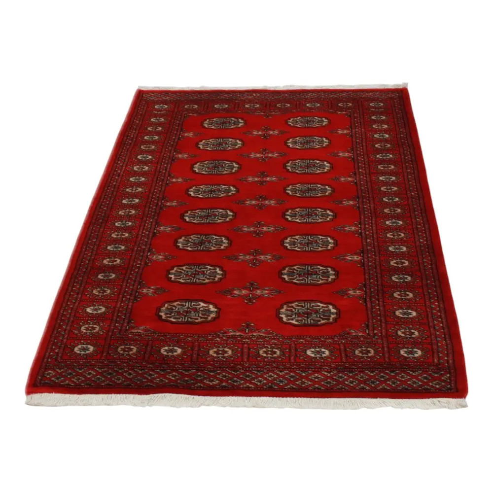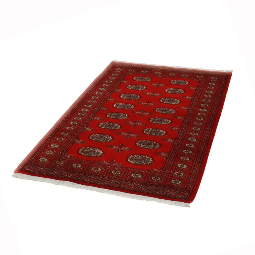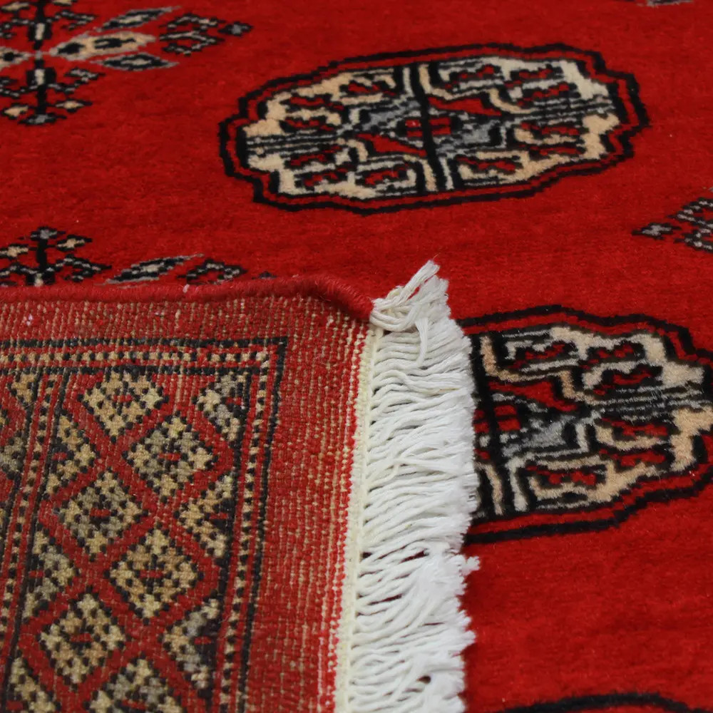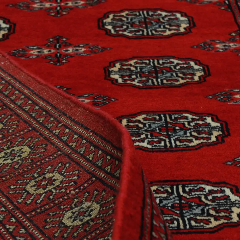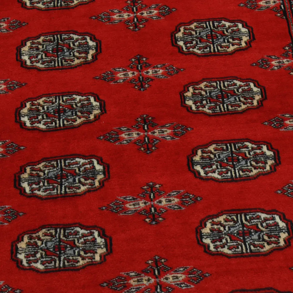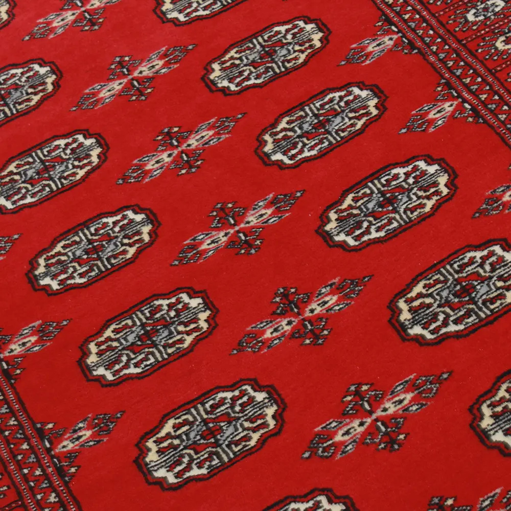 Pakistani carpet is made in the provinces of Punjab and Sindh. Reflecting a centuries-old tradition, this oriental carpet is a tribute to the craftsmanship and artistry of artisans. Pakistani carpets are renowned worldwide for their quality and carry the rich cultural heritage of Pakistan. The design and manufacturing techniques of this oriental carpet originate from the Turkmen people, who traded them in the old carpet market of the famous city of Bukhara. One of the most famous designs (Bukhara) takes its name from here and has been a defining feature of these beautiful oriental carpets ever since. Pakistani carpets are made from New Zealand Merino wool, which provides outstanding quality and durability. Thanks to their dense knotting, they are long-lasting and resistant to wear and tear from everyday use. This elegant rug is now considered one of the finest wool rugs in Pakistan. After being made and sheared, the carpet is washed four times and then carefully dried to retain its vibrant colours and colour fastness. With their geometric patterns and elegant colours, they add a unique ambience to your home, whether it's a living room carpet to enhance the elegance of the room or a bedroom carpet that adds comfort and softness to your steps. Also, an ideal choice for hallways is the Pakistani runner carpet. If you are looking for a unique oriental carpet that is made of quality material and shows artistic craftsmanship, Pakistani wool carpets are the perfect choice. The harmonious combination of sophisticated patterns and vibrant colours will create a magical atmosphere in any part of the room. A Pakistani carpet is not only aesthetically pleasing but also extremely practical. Its densely knotted surface is durable and resistant, allowing it to remain in beautiful condition for many years. In addition, the natural properties of the wool material allow it to insulate the floor, giving it excellent thermal insulation properties. Pakistani carpets are available in a wide range of sizes and shapes, so everyone can find the best one for their home.