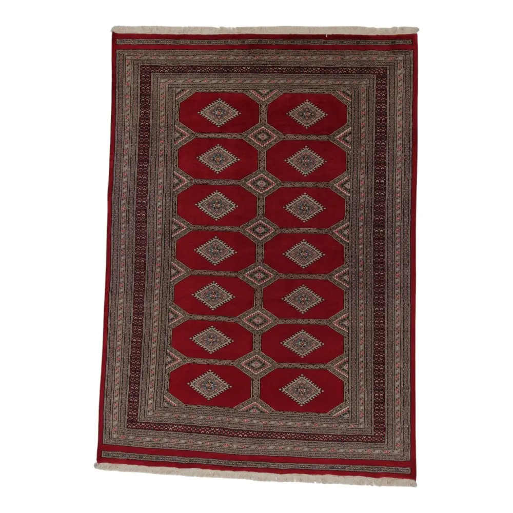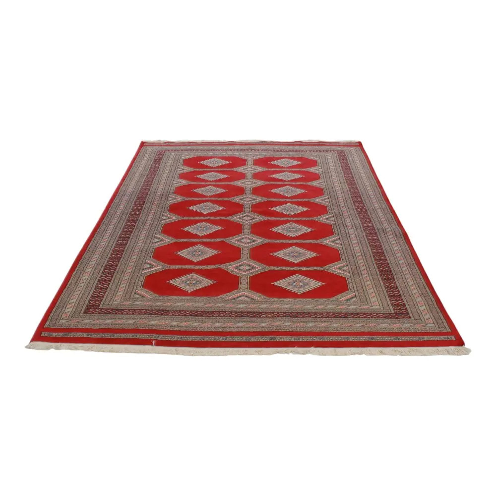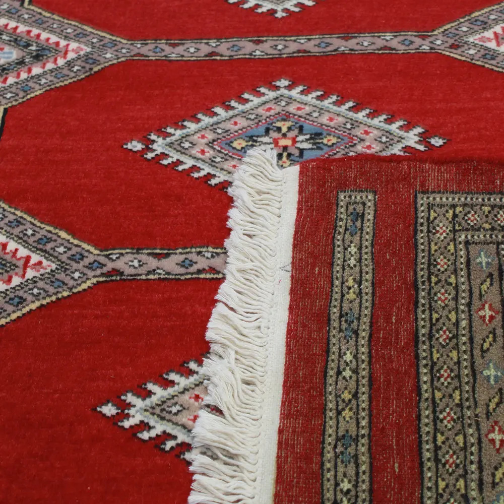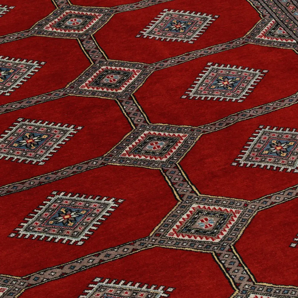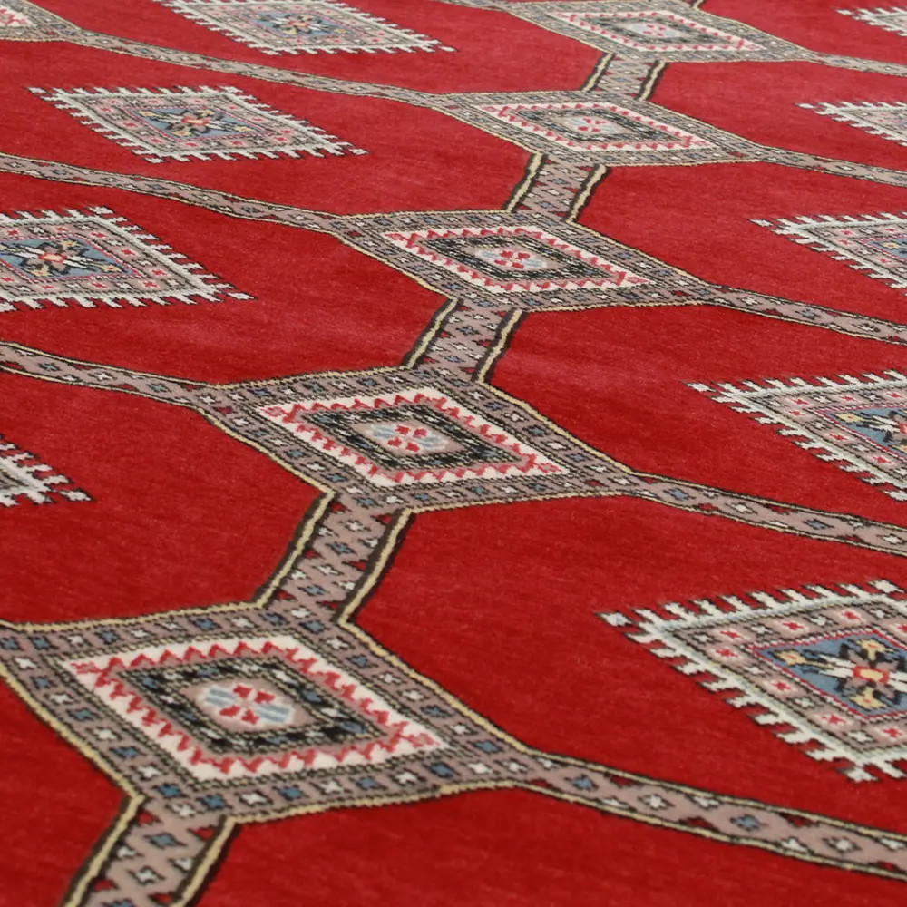Pakistani carpet is made in the provinces of Punjab and Sindh. Reflecting a centuries-old tradition, this oriental carpet is a tribute to the craftsmanship and artistry of artisans. Pakistani carpets are renowned worldwide for their quality and carry the rich cultural heritage of Pakistan. The design and manufacturing techniques of this oriental carpet originate from the Turkmen people, who traded them in the old carpet market of the famous city of Bukhara. One of the most famous designs (Bukhara) takes its name from here and has been a defining feature of these beautiful oriental carpets ever since. Pakistani carpets are made from New Zealand Merino wool, which provides outstanding quality and durability. Thanks to their dense knotting, they are long-lasting and resistant to wear and tear from everyday use. This elegant rug is now considered one of the finest wool rugs in Pakistan. After being made and sheared, the carpet is washed four times and then carefully dried to retain its vibrant colours and colour fastness. With their geometric patterns and elegant colours, they add a unique ambience to your home, whether it's a living room carpet to enhance the elegance of the room or a bedroom carpet that adds comfort and softness to your steps. Also, an ideal choice for hallways is the Pakistani runner carpet. If you are looking for a unique oriental carpet that is made of quality material and shows artistic craftsmanship, Pakistani wool carpets are the perfect choice. The harmonious combination of sophisticated patterns and vibrant colours will create a magical atmosphere in any part of the room. A Pakistani carpet is not only aesthetically pleasing but also extremely practical. Its densely knotted surface is durable and resistant, allowing it to remain in beautiful condition for many years. In addition, the natural properties of the wool material allow it to insulate the floor, giving it excellent thermal insulation properties. Pakistani carpets are available in a wide range of sizes and shapes, so everyone can find the best one for their home.