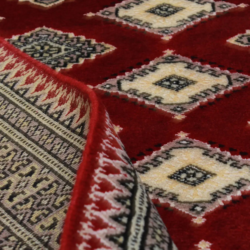 Pakistani carpet is made in the provinces of Punjab and Sindh. Reflecting a centuries-old tradition, this oriental carpet is a tribute to the craftsmanship and artistry of artisans. Pakistani carpets are renowned worldwide for their quality and carry the rich cultural heritage of Pakistan. The design and manufacturing techniques of this oriental carpet originate from the Turkmen people, who traded them in the old carpet market of the famous city of Bukhara. One of the most famous designs (Bukhara) takes its name from here and has been a defining feature of these beautiful oriental carpets ever since. Pakistani carpets are made from New Zealand Merino wool, which provides outstanding quality and durability. Thanks to their dense knotting, they are long-lasting and resistant to wear and tear from everyday use. This elegant rug is now considered one of the finest wool rugs in Pakistan. After being made and sheared, the carpet is washed four times and then carefully dried to retain its vibrant colours and colour fastness. With their geometric patterns and elegant colours, they add a unique ambience to your home, whether it's a living room carpet to enhance the elegance of the room or a bedroom carpet that adds comfort and softness to your steps. Also, an ideal choice for hallways is the Pakistani runner carpet. If you are looking for a unique oriental carpet that is made of quality material and shows artistic craftsmanship, Pakistani wool carpets are the perfect choice. The harmonious combination of sophisticated patterns and vibrant colours will create a magical atmosphere in any part of the room. A Pakistani carpet is not only aesthetically pleasing but also extremely practical. Its densely knotted surface is durable and resistant, allowing it to remain in beautiful condition for many years. In addition, the natural properties of the wool material allow it to insulate the floor, giving it excellent thermal insulation properties. Pakistani carpets are available in a wide range of sizes and shapes, so everyone can find the best one for their home.