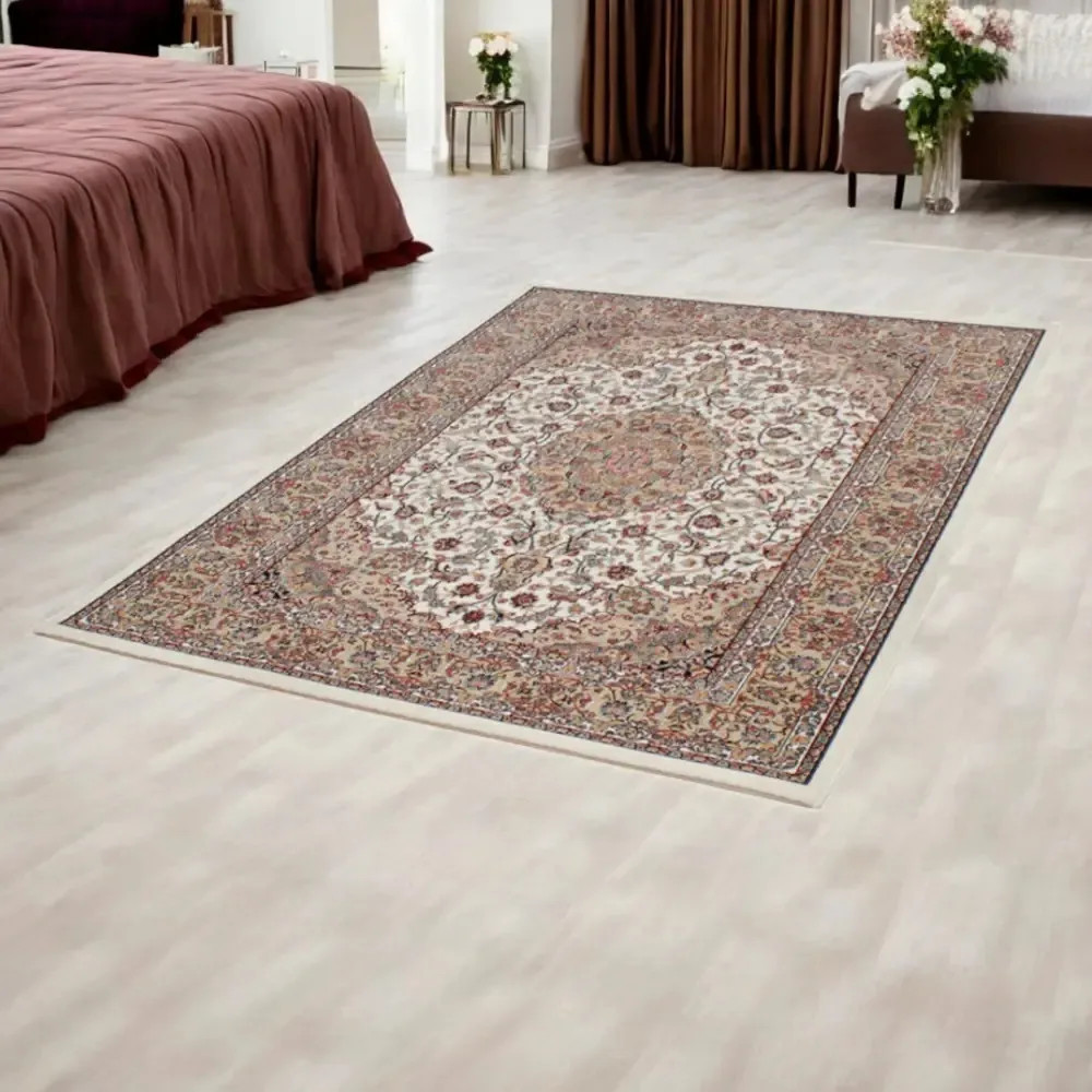 Discover the elegance of a Persian carpet cream Medalion, designed to bring sophistication to any space. This quality acrylic carpet, sized at 140x200 cm, combines the traditional Persian aesthetic with modern durability.