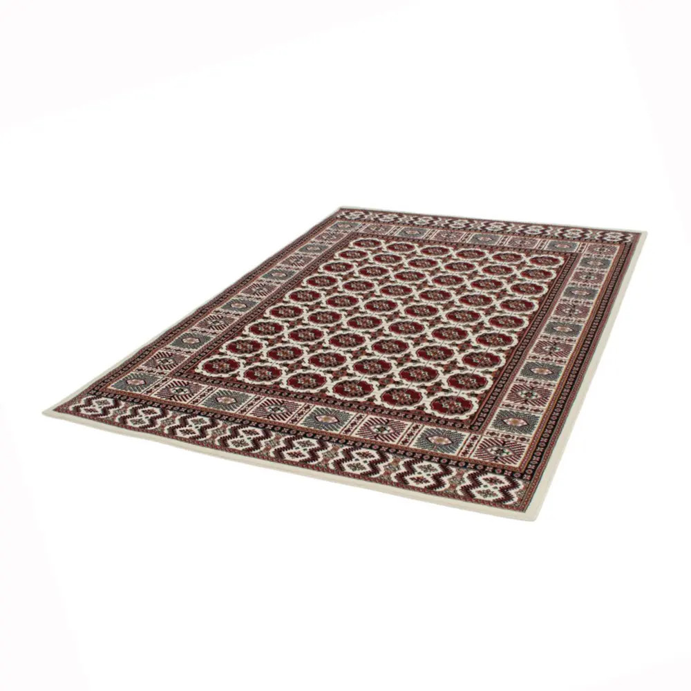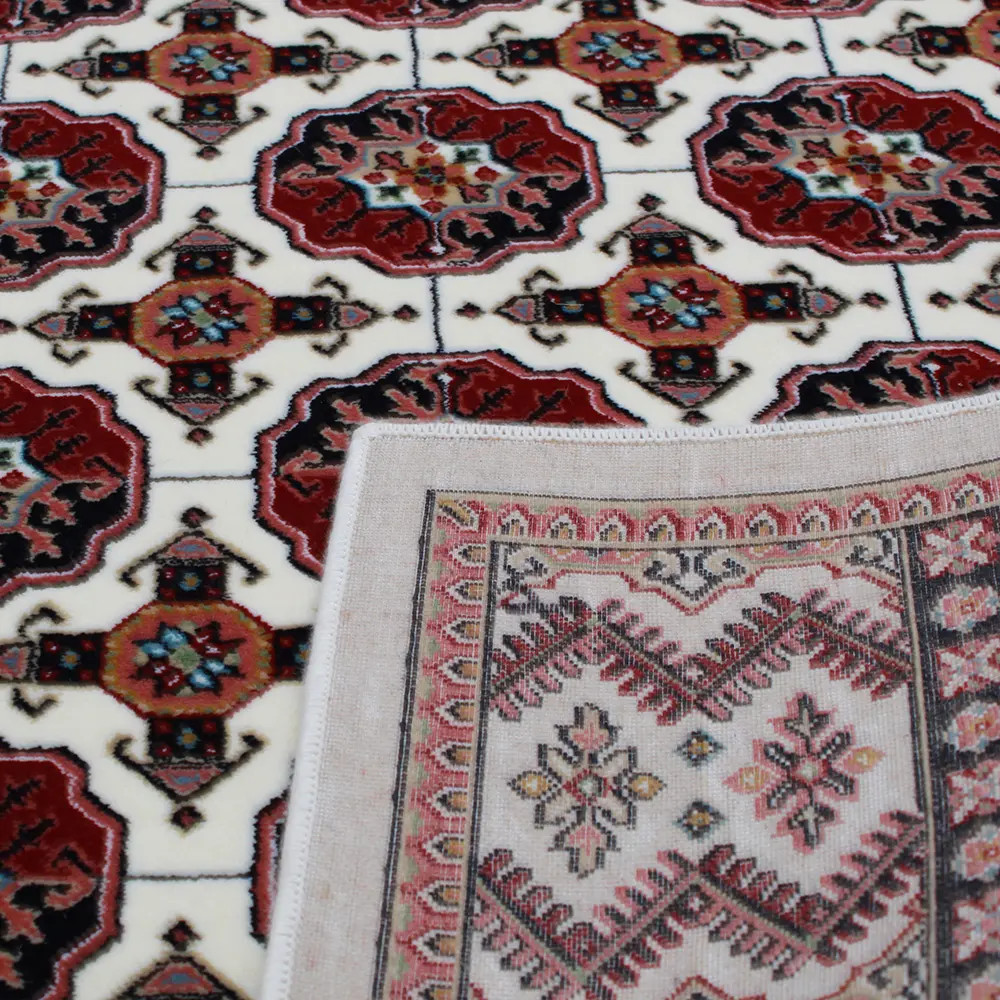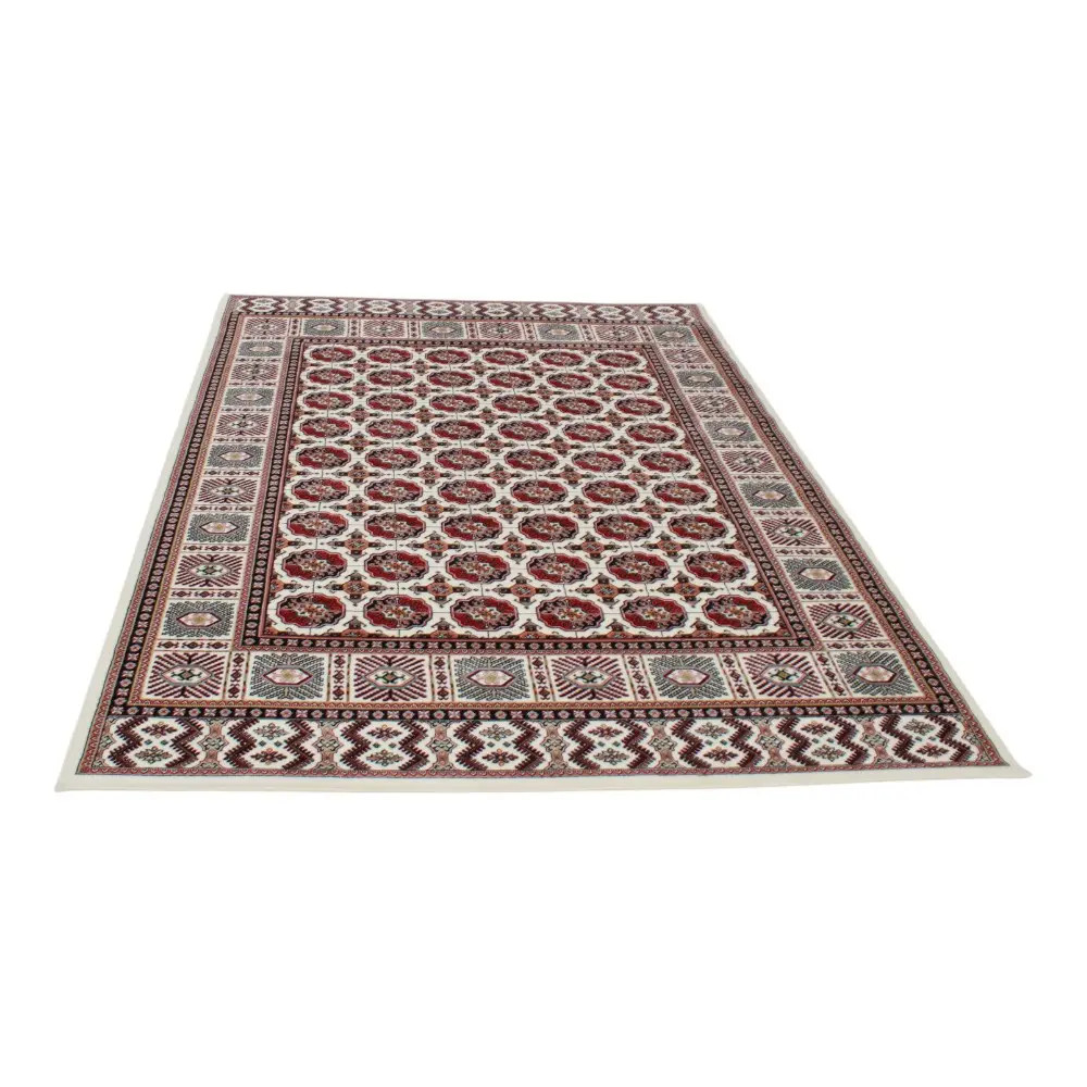 The Persian rug in cream, featuring the renowned Bokhara design, is an ideal choice for those seeking luxury and comfort in one. Its acrylic composition mimics the softness of wool, ensuring a pleasant feel underfoot. The intricate patterns and rich colors create a warm and inviting environment, making it perfect for any home. This luxury carpet of acrylic is not only a visual delight but also offers long-lasting durability, making it a wise investment for your living space.