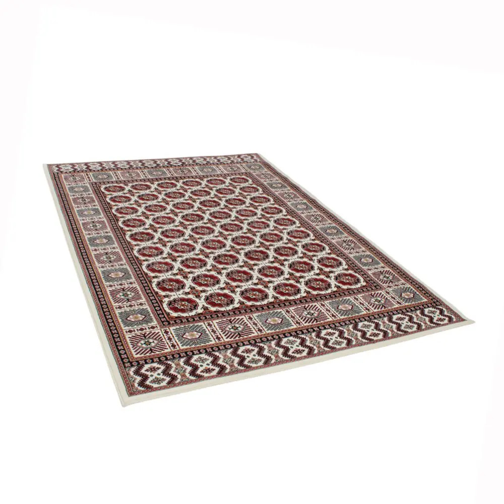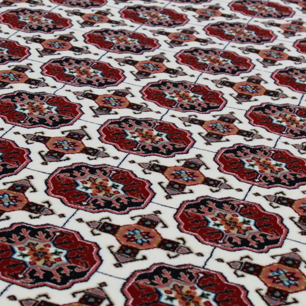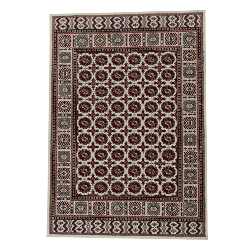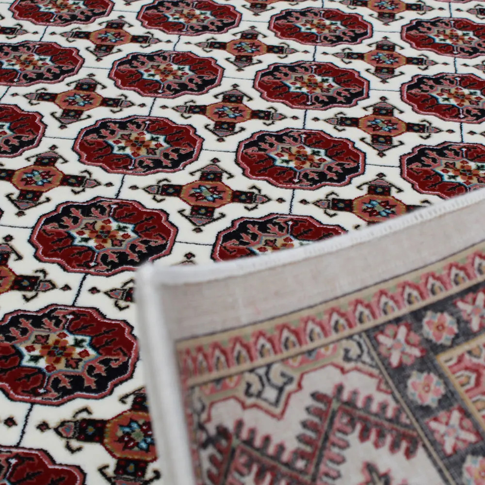 The Persian rug in cream, featuring the renowned Bokhara design, is an ideal choice for those seeking luxury and comfort in one. Its acrylic composition mimics the softness of wool, ensuring a pleasant feel underfoot. The intricate patterns and rich colors create a warm and inviting environment, making it perfect for any home. This luxury carpet of acrylic is not only a visual delight but also offers long-lasting durability, making it a wise investment for your living space.