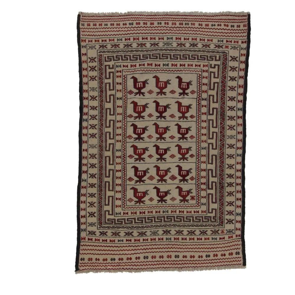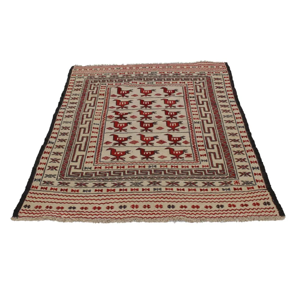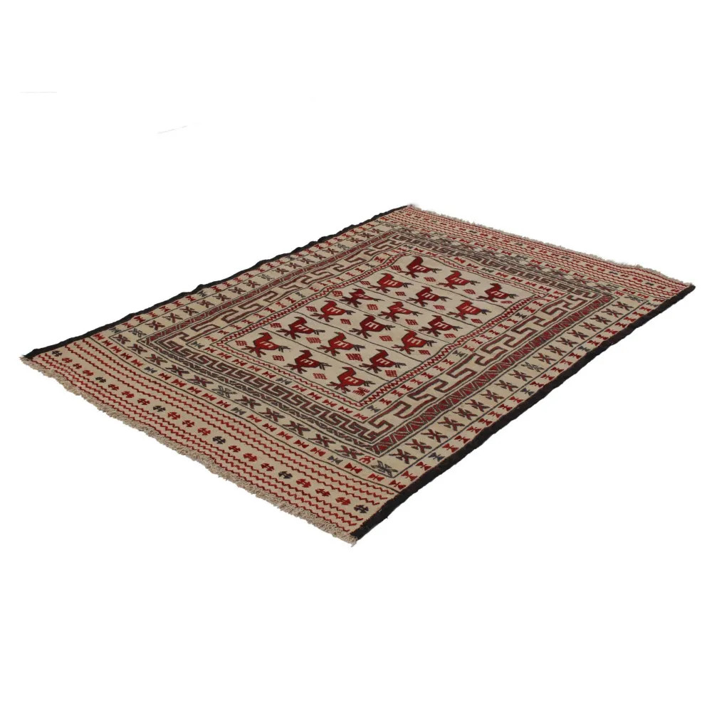 Afghan tribal Kilim carpets produced in Afghanistan stand out among the hand-woven Kilim carpets. This unique nomadic rug making tradition has its roots in Afghanistan and reflects the rich cultural heritage of the nomadic tribes. Today, workshops in the city of Herat, Afghanistan, produce these masterpieces, also known as Herati Beluch rugs. The tribal Kilim carpet is a true masterpiece, made by local artisans and carpet weavers. The city of Herat is famous in Afghanistan for its traditional hand-made carpet weaving, which has a long and rich history dating back centuries. The people of Herat have remained faithful to the traditional carpet weaving technique even today. Timeless weaving techniques and knowledge passed down through generations meet in the making of tribal kilim. The distinctive qualities and decorations of the Afghan Kilim rug are impressive. They are dominated by geometric or animal designs that reflect traditional Afghan design and nomadic traditions. The tribal Kilim carpet is therefore not only captivating in its beauty, but also in its rich cultural heritage.