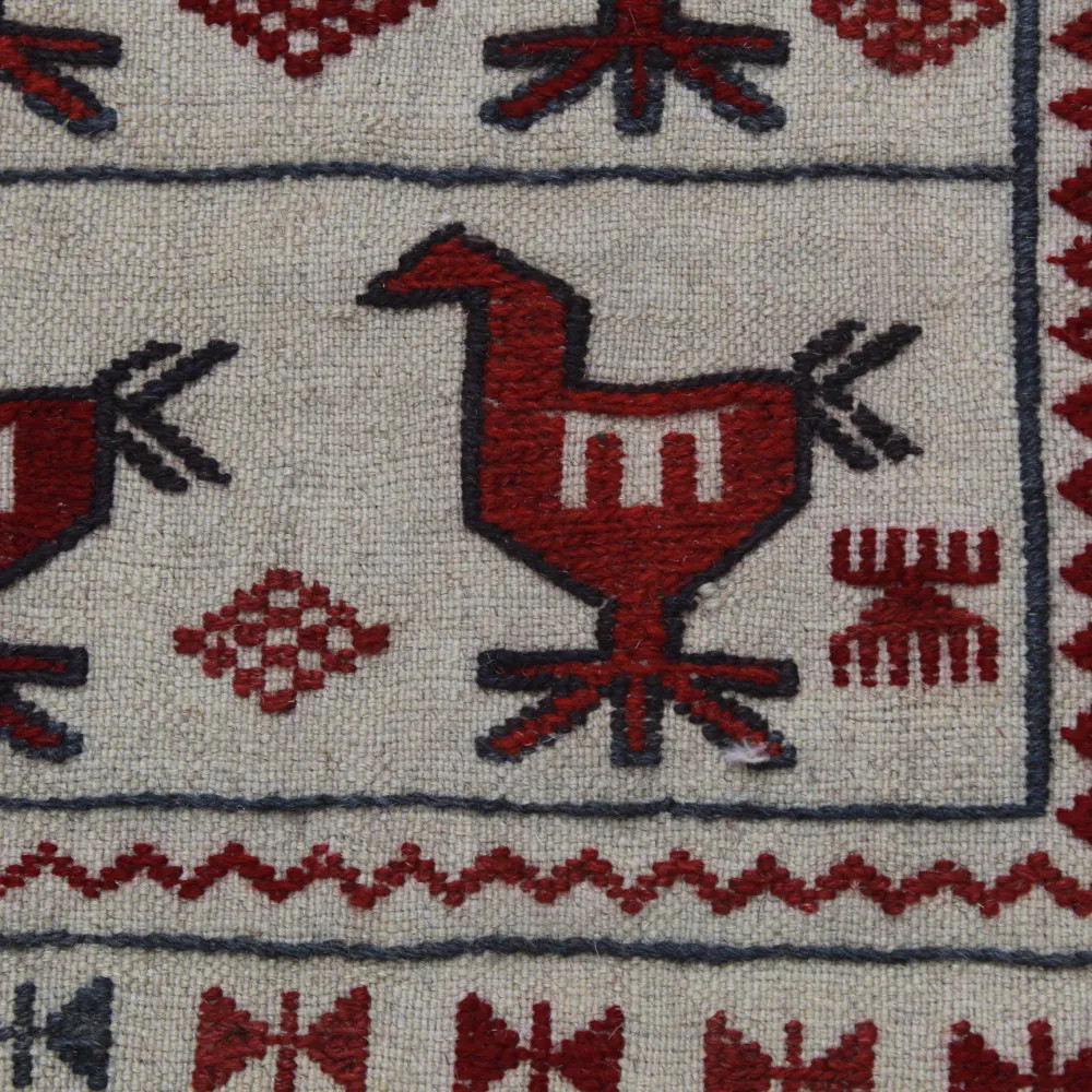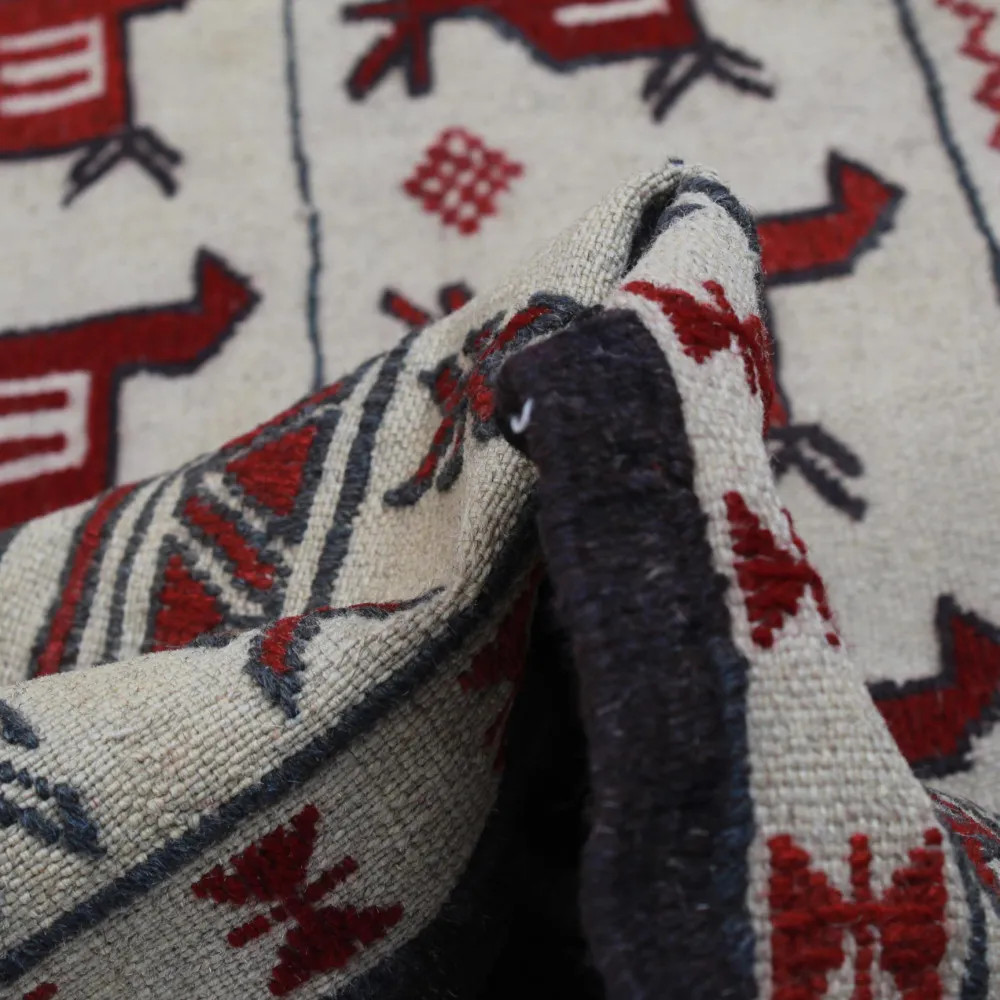 The Afghan tribal kilim carpet reflects the cultural heritage of Afghanistan. These masterpieces evoke the traditions and art of nomadic tribes. With their stunning antique designs, they will make a real showpiece in your home, either spread on the floor or hung on the wall as a wall rug. Each piece of the hand-woven tribal kilim carpet is unique. Used as a wall carpet, a tribal kilim rug can be a real decorative feature on any wall in your home. Geometric patterns and animal motifs contribute to the unique atmosphere and warmth of your home. The Afghan nomadic rug tells the story of the tribes' way of life and their traditions. A tribal wall rug is not only a decorative object, but also a precious handicraft that brings Afghan tribal art and culture closer to you directly through the walls of your home. The tribal kilim carpet is made from high quality wool, which ensures durability and easy cleaning. This nomadic carpet is the perfect choice if you want to create a unique and stunning interior design for your home.