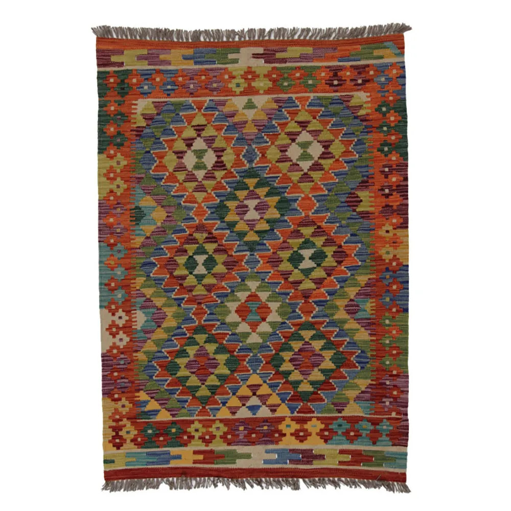 Chobi Kelim rugs are very popular all over the world. In Afghanistan, they are hand woven by nomads and villagers. This type of Afghan Kelim rug is denser and more compact than other Kelim rugs. They are woven using a special technique which makes them thinner and therefore relatively quicker to weave than traditional oriental rugs.. After making, they are washed four times and then sun-dried. Afghan Kelim rugs have a traditional warm antique design, but are often available in a more modern version. They are very popular, mainly because they blend perfectly with most room colours, and fall into the category of reasonably priced rugs. They can be used as a decorative feature in the home, as a wall rug or as a traditional floor covering. Kelim, is the perfect rug for the living room or even for hallways or corridors as a runner rug.